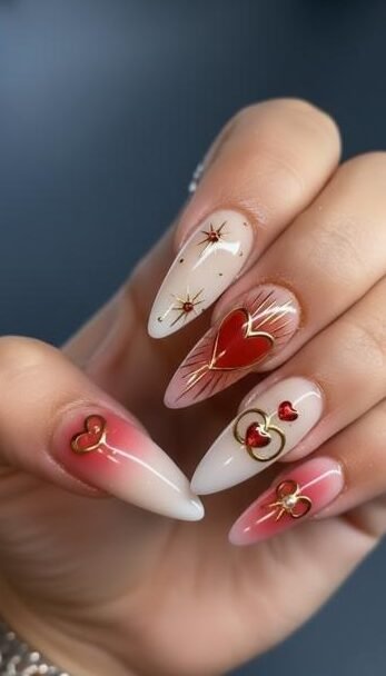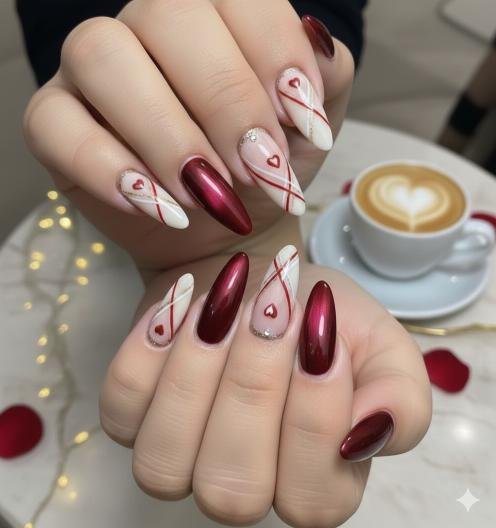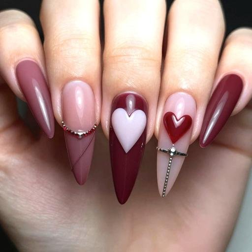 The pointed silhouette alone adds confidence, edge, and high-fashion energy, making stiletto nails one of the boldest choices for Valentine’s nail designs.
