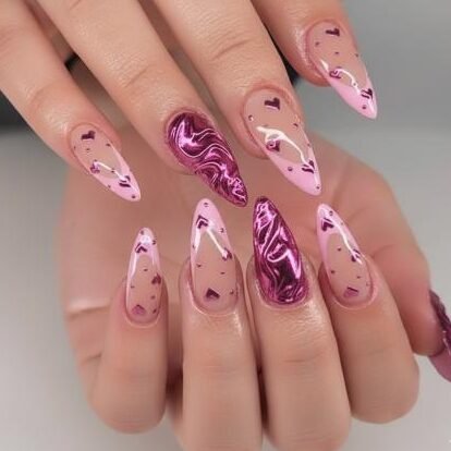 From heart nail art on stiletto nails to chrome, nude, and romantic pink designs, stiletto nails turn every manicure into a statement.
