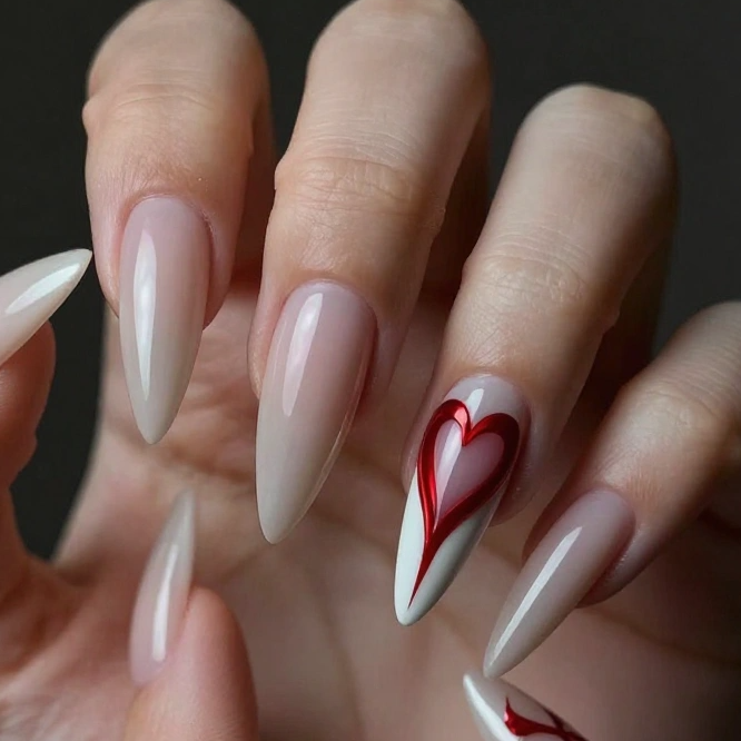 Stiletto Valentine’s Day nails are like claws, sharp, sculpted, and impossible to ignore. This dramatic nail shape has the power to instantly elevate any look, whether you’re wearing a cozy outfit, a sleek dress, or keeping things minimal.