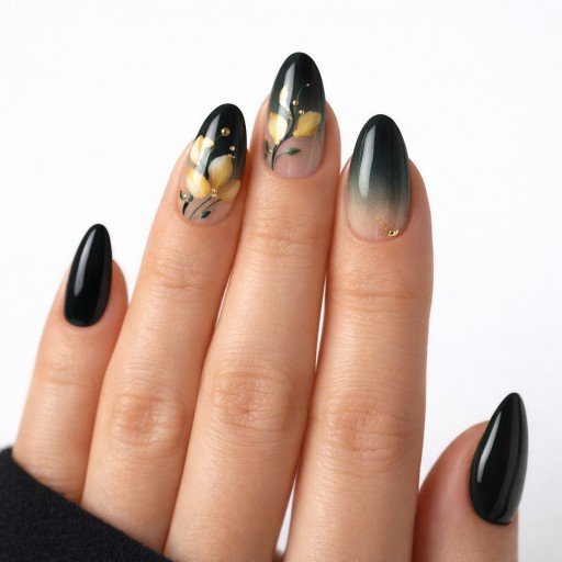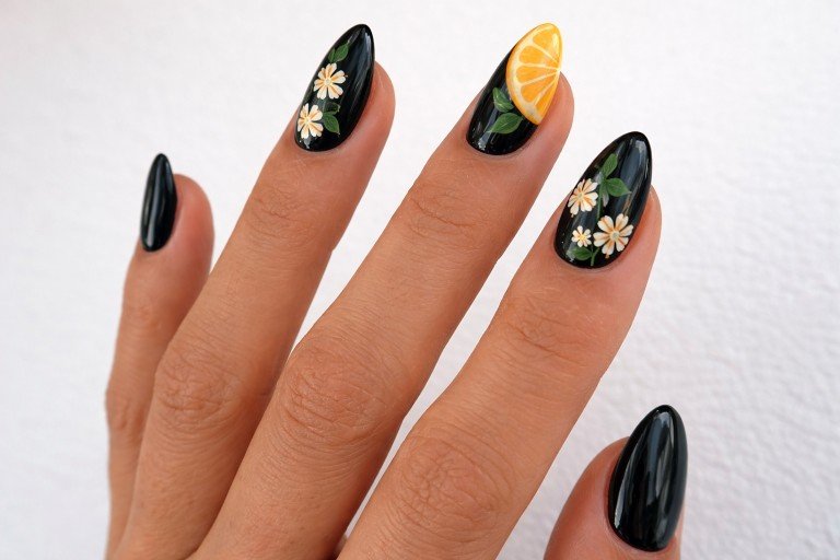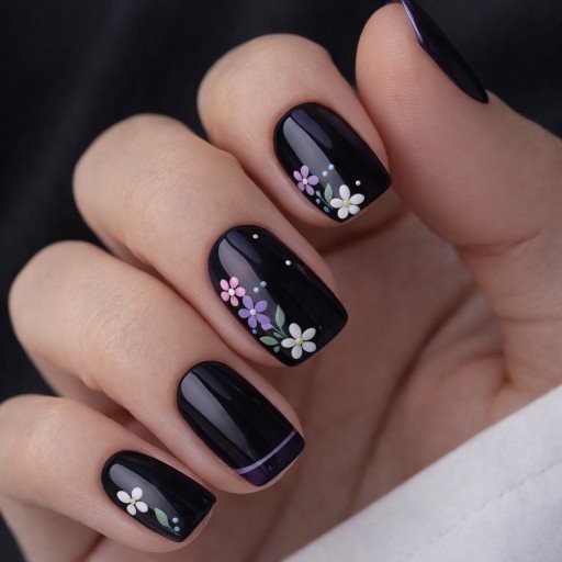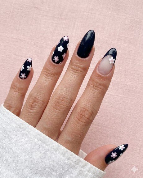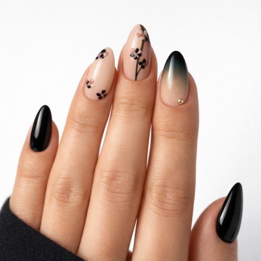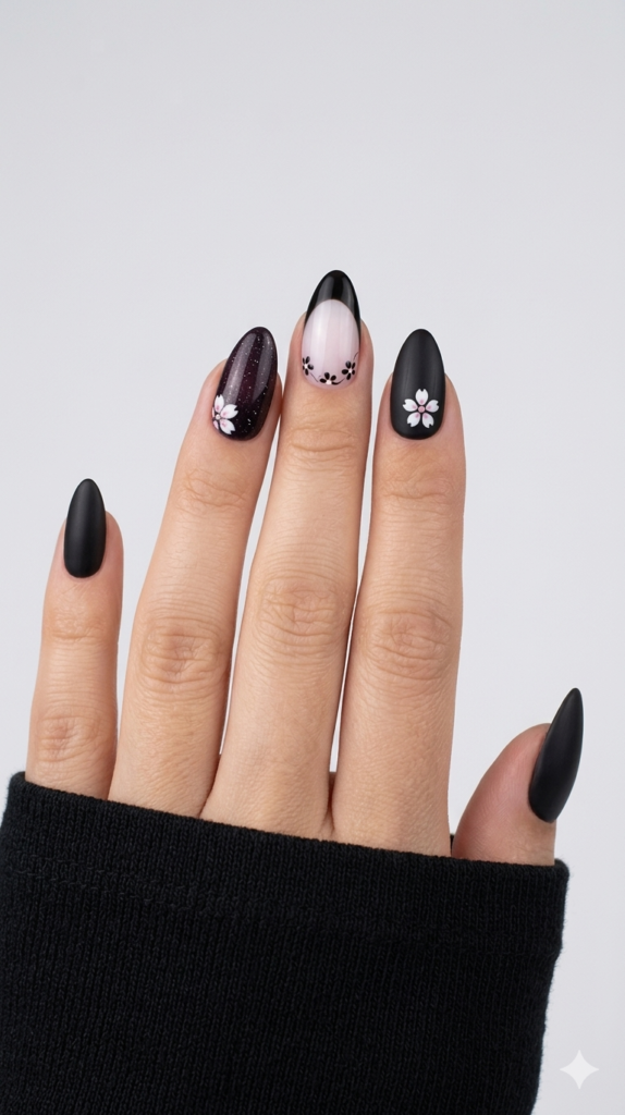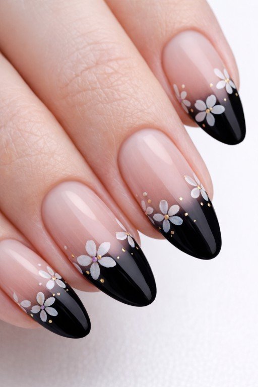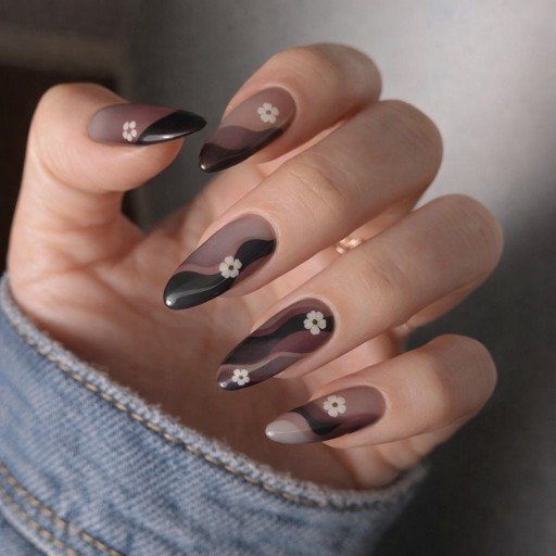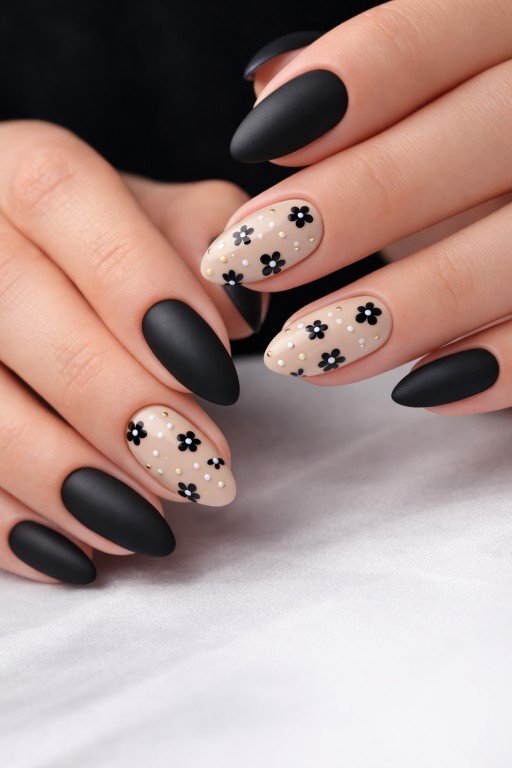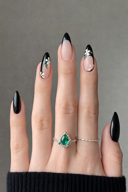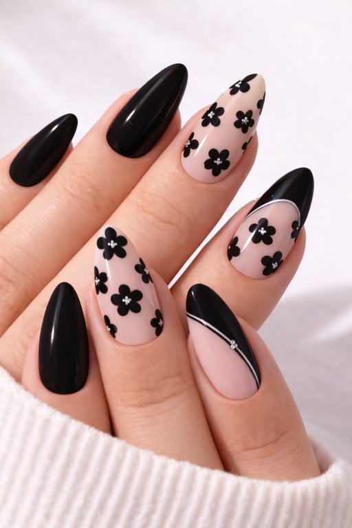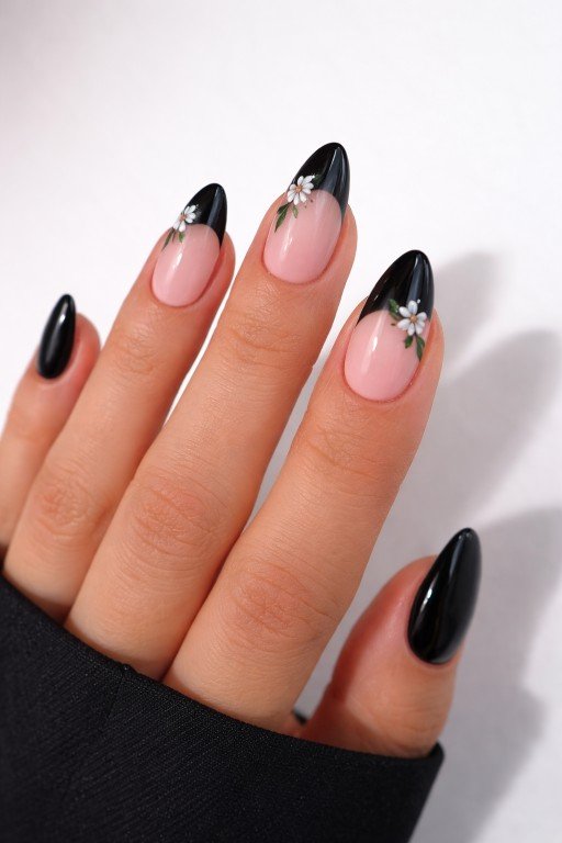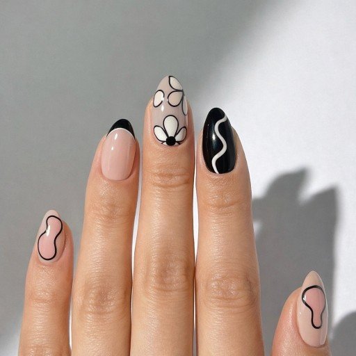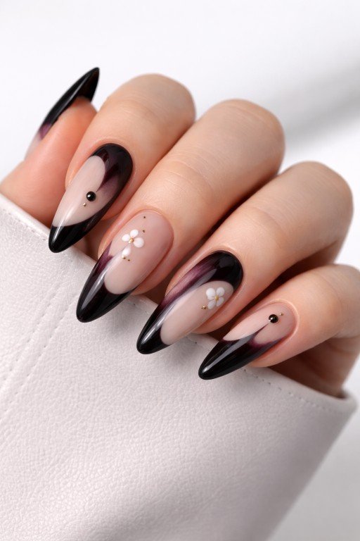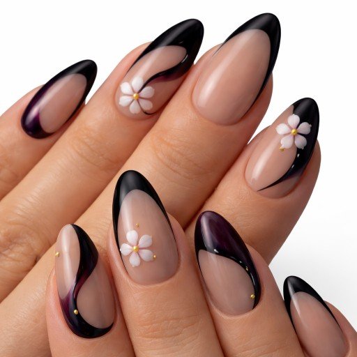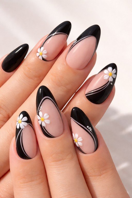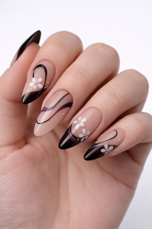 24. Moody Nude & Black Wave Nails with Minimal Flowers