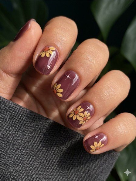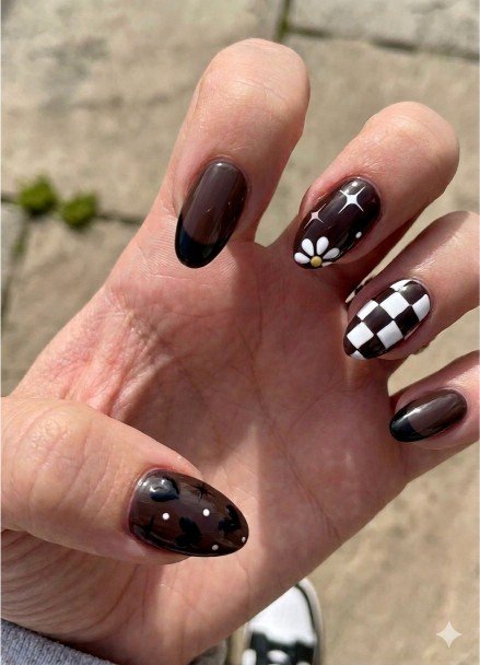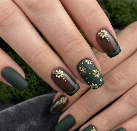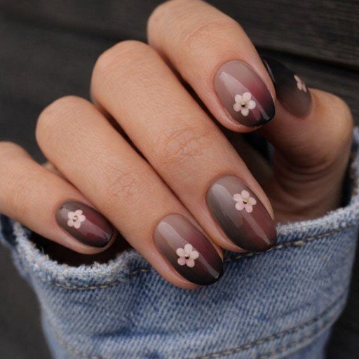 22. Muted Brown Ombre Nails with Tiny Flower Details