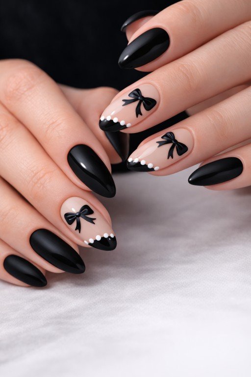 26. Chic Black Bow Nails with Minimal Pearl Details