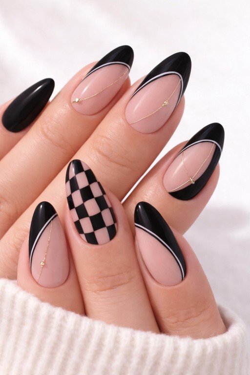 27. Black French Tip Nails with Gold Line Accents & Checkered Detail