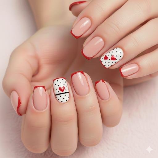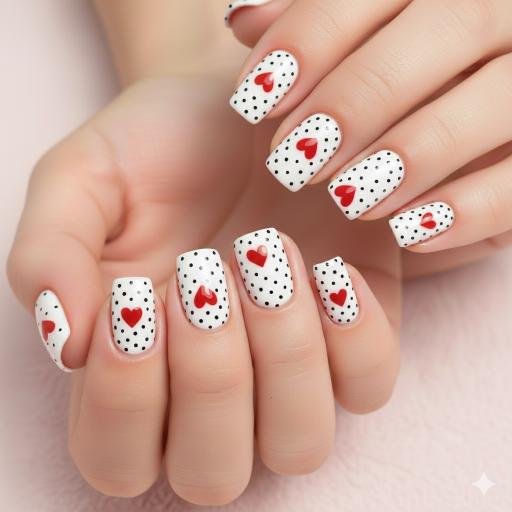 These are absolutely adorable! White base with black polka dots and those little red hearts scattered throughout—it’s giving retro Valentine’s card energy. Super playful and cute without being childish. The combination of dots and hearts works really well together. These would be perfect for someone who wants a fun, lighthearted Valentine’s look. Though getting all those dots even would definitely require patience!