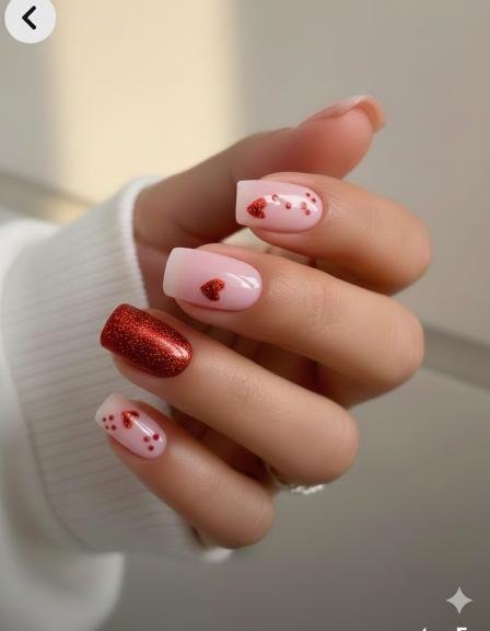 This one’s all about that soft, romantic vibe. The pink base is subtle and pretty, then you’ve got one full red glitter nail as a statement, plus scattered glitter hearts on the others. It’s sweet and delicate—like Valentine’s Day in pastel form. These feel more understated compared to some of the bolder designs, perfect for someone who wants festive but not in-your-face.