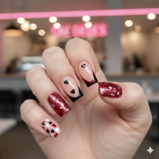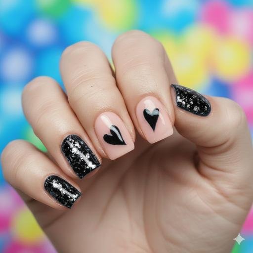 This one’s got attitude! The black glitter nails paired with that soft pink base and bold black hearts—it’s edgy romance. The contrast between the sparkly black and the matte-ish pink is really striking. Those heart designs are simple but effective, and the whole vibe is like “Valentine’s Day but make it cool.” Not too sweet, not too dark—just right if you want something a bit different from the typical red-and-pink combo.
