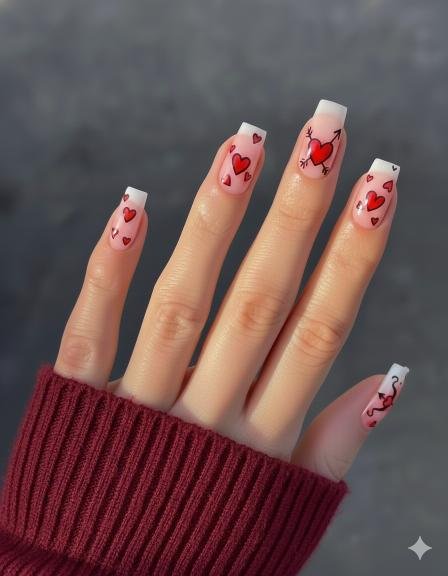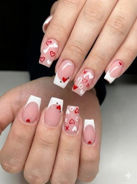 These are SO cute! The white French tips with those hand-drawn style hearts, XOs, and little arrows—it’s like doodles from a crush note turned into nail art. Super playful and flirty. The mix of red and pink hearts with the little accent details gives it personality. These feel young and fun, perfect for Valentine’s Day or just celebrating love in general.