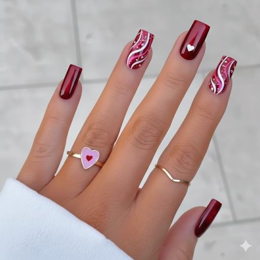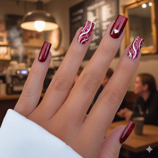 This is elegance right here. That deep burgundy wine color is gorgeous, and those swirled designs with the tiny white hearts add sophistication. It’s romantic but in a grown-up, classy way. The swirls give it an artistic touch that elevates it beyond basic Valentine’s nails. These would be perfect for a fancy dinner date—they’re sexy without trying too hard.