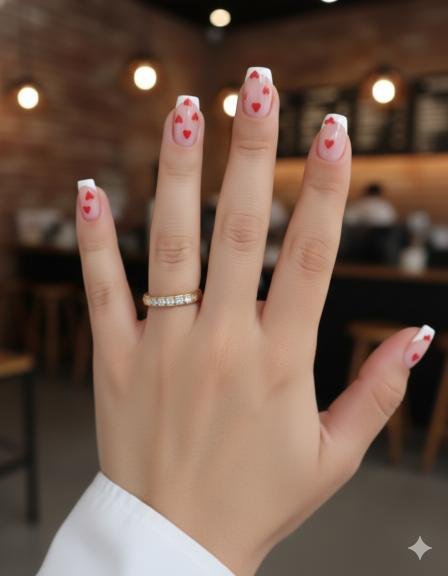 Now THIS is classic Valentine’s energy! The mix of nude base with white tips, plus those glossy red hearts in different styles—some filled, some outlined—it’s romantic without being over the top.