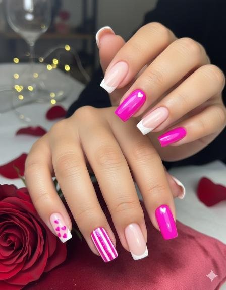 Bold! That hot pink is definitely making a statement mixed with the soft pink and white nails. The little white heart accents and the striped detail add variety. These feel fun and energetic—like Valentine’s Day party nails. The bright pink gives it a youthful, confident vibe. Not subtle at all, but that’s kind of the point.