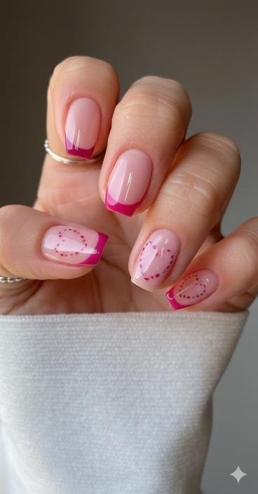 Last but not least—these are understated and lovely. The pink ombré French tips are soft and pretty, then those dotted heart outlines add just enough Valentine’s detail without overdoing it. The gradient effect is smooth and the hearts feel delicate. These are perfect for someone who wants festive nails that still feel natural and wearable for everyday.