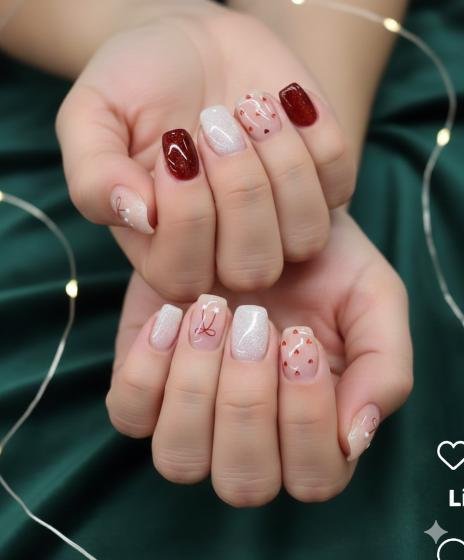 Okay, this set is doing a LOT and I’m kind of loving it. You’ve got deep burgundy nails, white shimmer nails, hand-drawn hearts with outlines, scattered mini hearts, plus those cute little curl designs. It’s like they couldn’t pick just one Valentine’s vibe so they did them all. The variety keeps it interesting and the mix of burgundy and soft pink with white shimmer is really pretty. Definitely more on the playful, fun side.