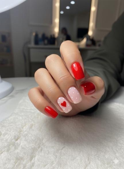 Simple but effective! Mostly glossy red nails with that one pink nail featuring white polka dots and a red heart. The pop of pattern on just one nail keeps it from being too plain but doesn’t overdo it either. This feels like classic Valentine’s energy—bright, cheerful, romantic. Easy to achieve too, which is a bonus. Sometimes simple really is best.