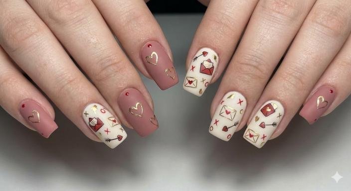 Okay, this is ADORABLE. The cream and mauve nails with those tiny envelope designs, hearts with arrows, XOs, and gold accents—it’s like old-school love letters turned into nail art. Super creative and different from the usual heart designs. The gold foil details add a nice touch of luxury. These have major personality and would definitely be a conversation starter. The detail work here is impressive!