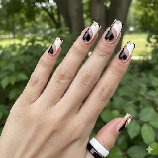 Okay, this is playful! The black French tips mixed with the hand-drawn bow and scattered black hearts—it’s like gift-wrapped romance. The bow detail is such a cute touch, very “you’re a present” energy. The mix of solid tips and detailed art nails creates nice contrast. These have personality and feel flirty and fun.