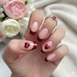 Last but not least! Deep burgundy French tips with those soft pink ombré hearts on the accent nails. The combination of the rich burgundy and soft pink is really pretty—it’s romantic but not overly cutesy. The heart placement feels intentional and artistic rather than random. These have that elegant-but-still-festive vibe that works if you want Valentine’s nails that don’t feel too young or casual.